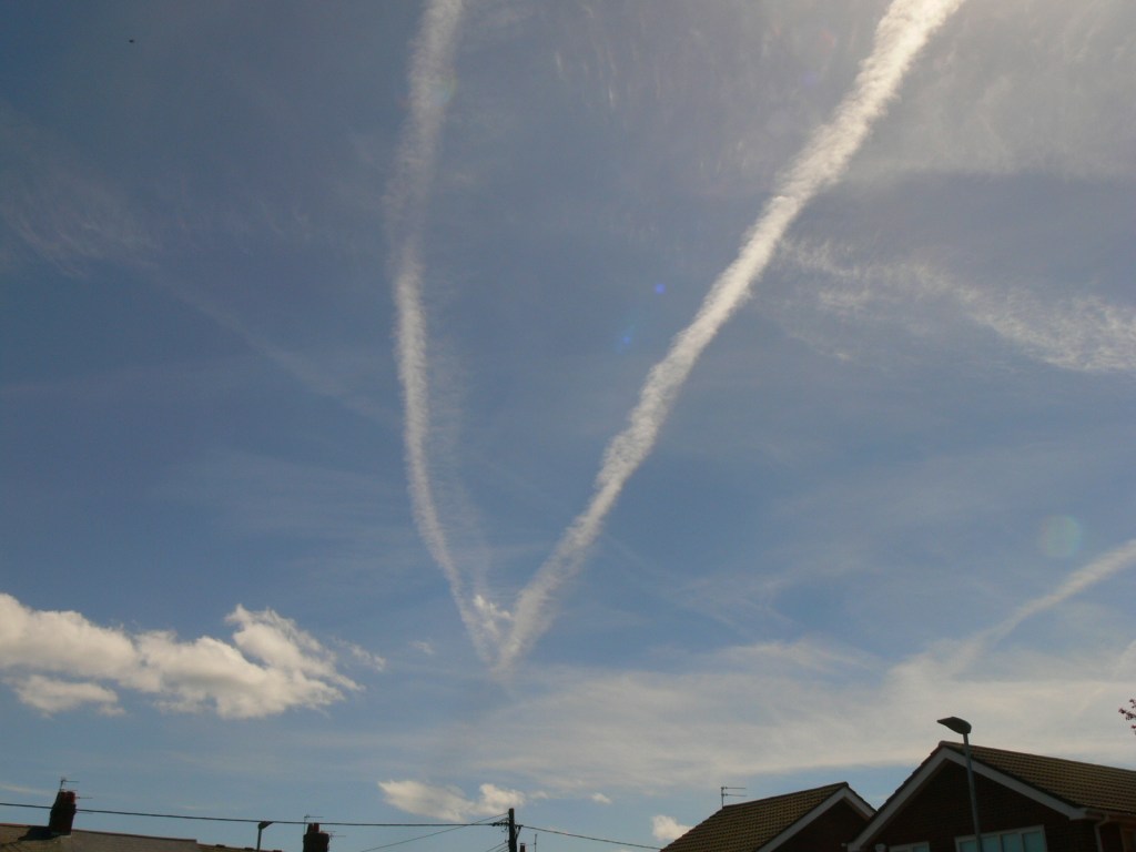 I can see seven trails in that chemtrail pic above, the oldest maybe from two hours ago. To argue the case for chemtrails being real, I suggest chemtrail has whitened the sky, obscured what should be a bright blue sky.